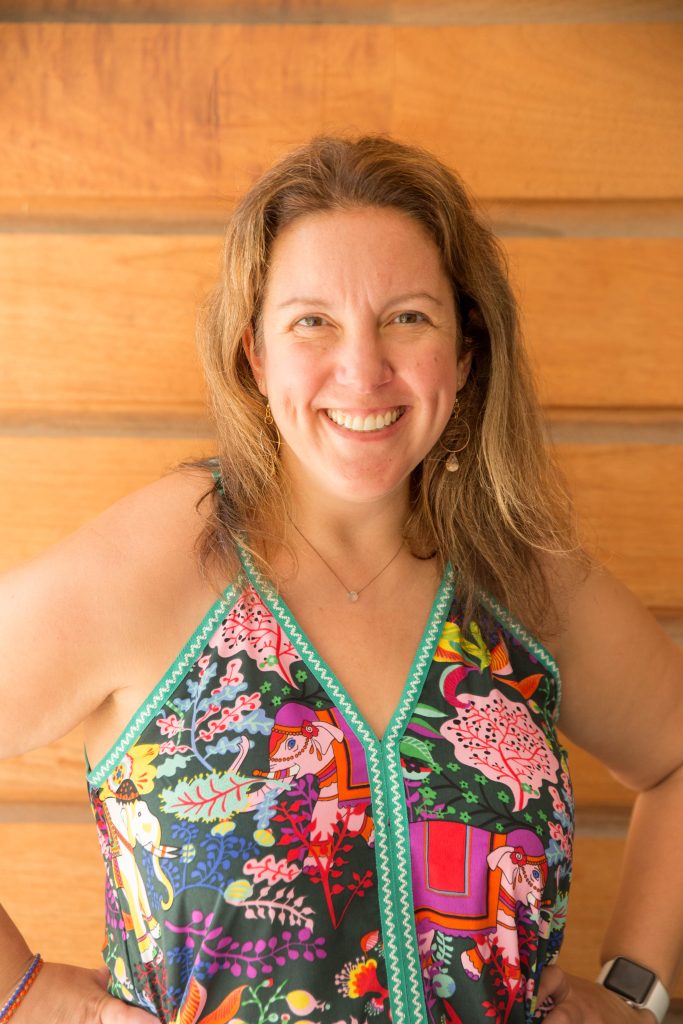 A photo of the author Megan Birch-McMichael, a white woman standing against a wooden backdrop with a multicolored dress.